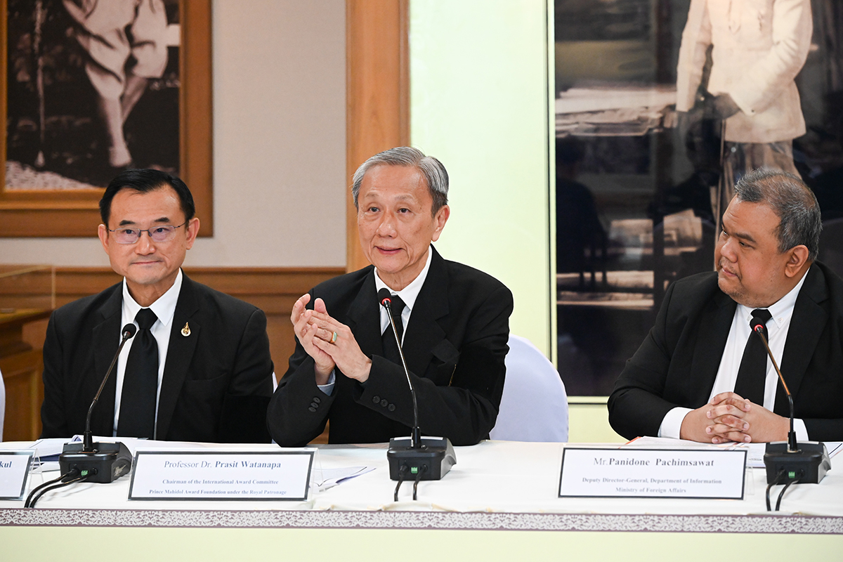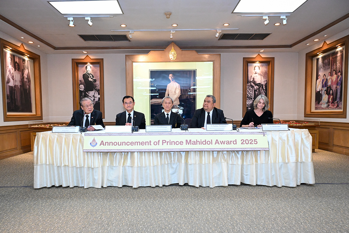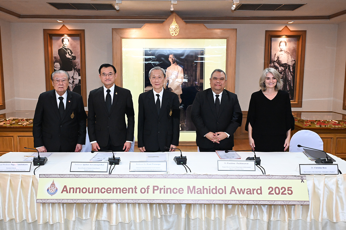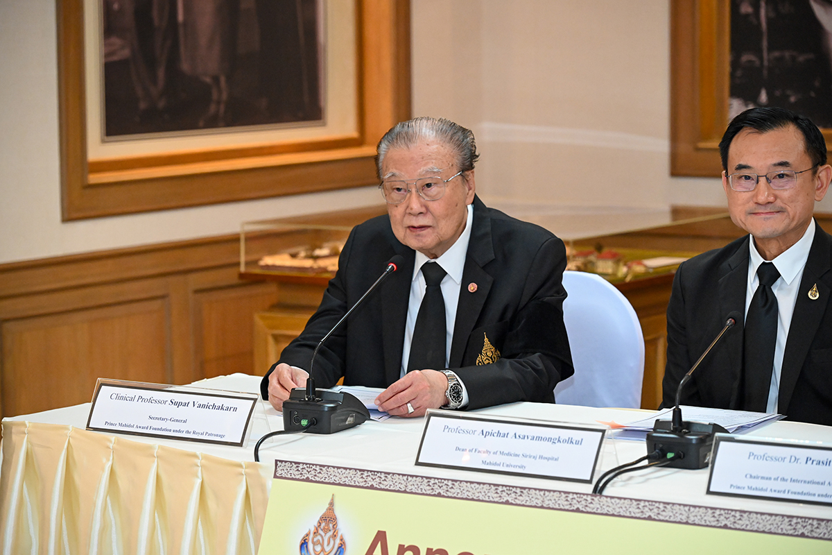 Today (27 November 2025) at 13.30 hrs., the annual Joint Press Conference was held to announce the 34th Prince Mahidol Award Laureates for 2025 at the Prince Mahidol Memorial Room, 2nd Floor, Syamindra Building, Siriraj Hospital, and addressed by Professor Apichat Asavamongkolkul, Dean of the Faculty of Medicine, Siriraj Hospital, Mahidol University, as Vice President of the Prince Mahidol Award Foundation; Clinical Professor Emeritus Supat Vanichakarn, Secretary General of the Prince Mahidol Award Foundation under the Royal Patronage; Mr. Panidone Pachimsawat, Deputy Director-General, Representative of Director-General, Department of Information, Ministry of Foreign Affairs of Thailand, in his capacity as the Chairman of the Sub-Committee on Public Relations of the Prince Mahidol Award Foundation; and Professor Emeritus Dr.Prasit Watanapa, Chairman of the International Award Committee of the Prince Mahidol Award Foundation.